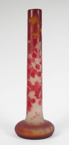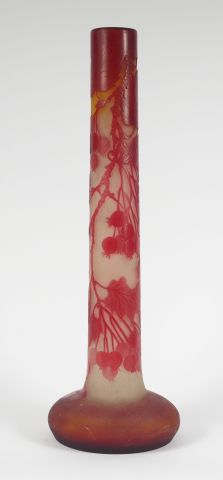 GALLE. Grand vase tube en verre, à décor gravé en camée et à l’acide de noisetier rouge sur fond blanc nuancé de jaune. Signé. (signature à l’étoile) H. : 60.5 cm