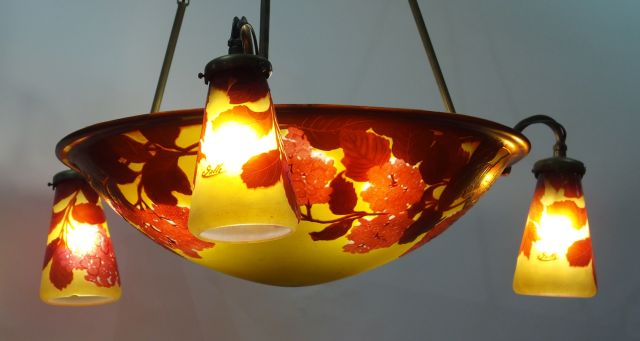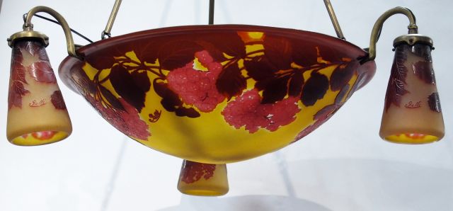 GALLE. Grande suspension en verre, décor d’hortensias rouge sur fond jaune, signée. Diam. 54.5 cm (une tulipe cassée)