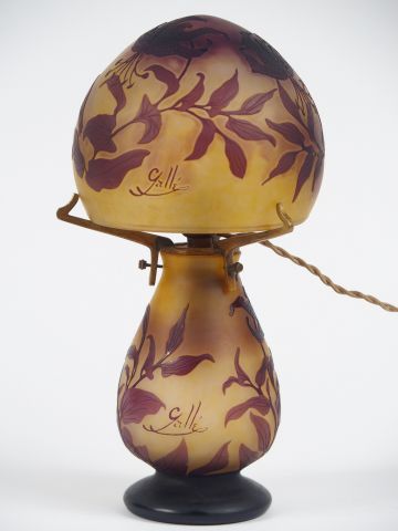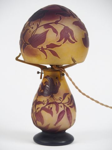 GALLE. Lampe en verre à décor gravé en camée et à l'acide de lys martagon sur fond clair. Signé. H. : 27,5 cm