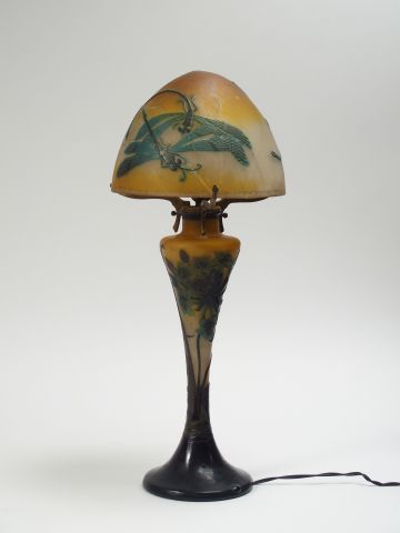 GALLE. Lampe en verre, décor gravé en camée à l'acide bleu et vert sur fond jaune de libellules et de fleurs (cassée). Signée. H. : 45 cm