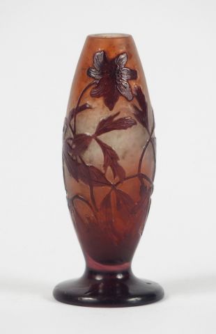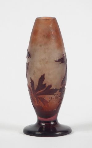 GALLE. Petit vase ovoïde en verre, à décor gravé en camée et à l’acide de fleurs et de feuillage mauve sur fond blanc et rosé. Signé. (deux micro-égrenures) H. : 13.5 cm