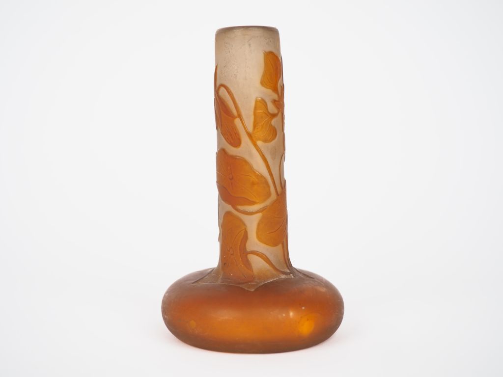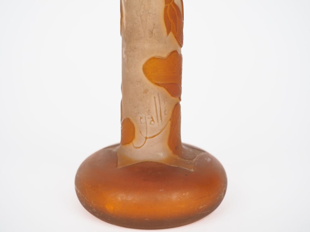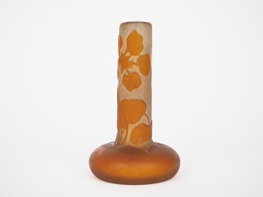 GALLE. Soliflore en verre à décor gravé en camée à l'acide de capucines oranges sur fond clair. H. 9.5 cm