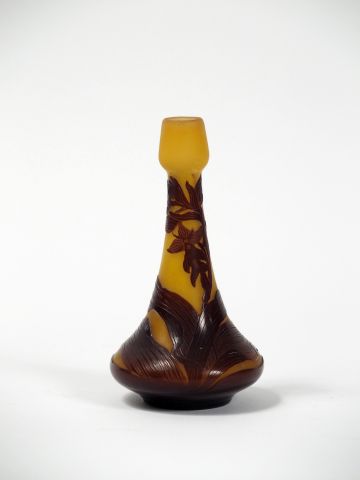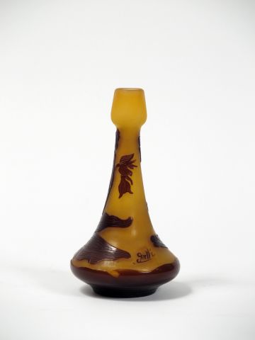 GALLE. Soliflore en verre, à décor gravé en camée et à l'acide de fleurs brunes sur fond jaune. Signé. H. : 13,5 cm