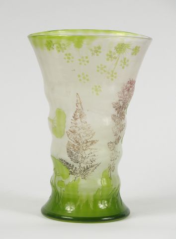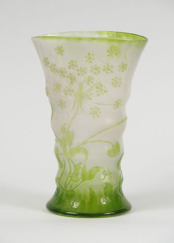 GALLE. Vase cornet en cristallerie, à décor de fleurs polychromes et de feuillage vert. Signé. H. : 24.5 cm