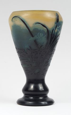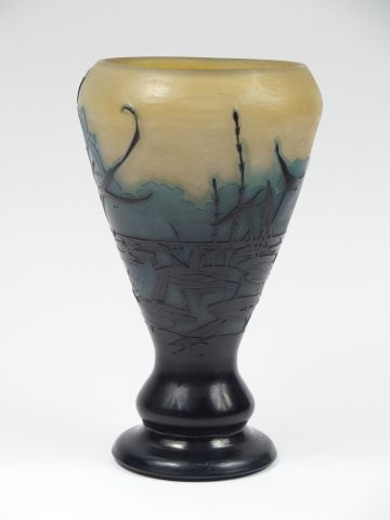 GALLE. Vase en verre, à décor aquatique gravé en camée et à l'acide dans les tons bleu, vert, brun et jaune. Signé. (signature à l'étoile) H. : 30 cm