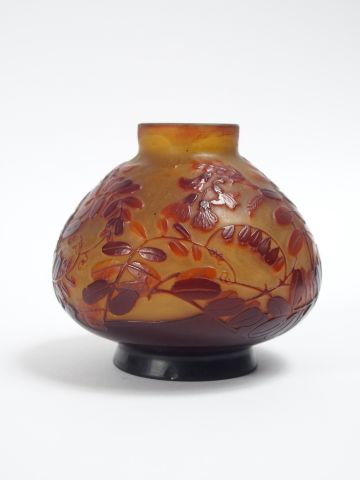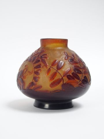 GALLE. Vase en verre, à décor gravé en camée et à l'acide de feuillages rouges sur fond jaune. H. : 10,5 cm.