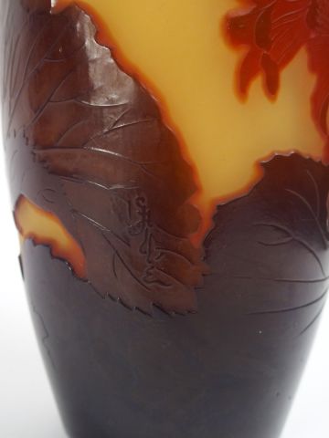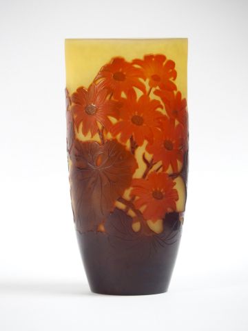GALLE. Vase en verre, à décor gravé en camée et à l'acide de fleurs rouges sur fond jaune. H. : 24,5 cm. Signé.