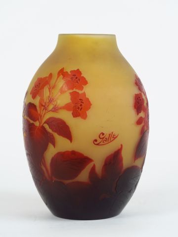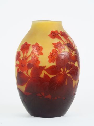 GALLE. Vase en verre à décor gravé en camée et à l'acide de fleurs rouges sur fond jaune Signé (col probablement rodé) H. 27 cm