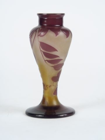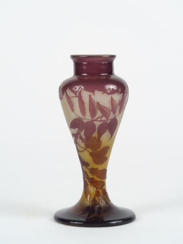 GALLE. Vase en verre à décor gravé en camée et à l'acide de glycines mauves sur fond blanc nuancé de jaune Signé H.16 cm