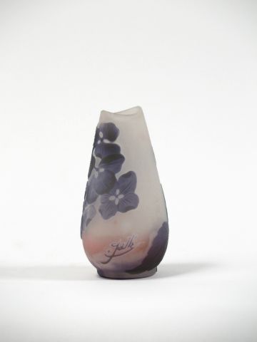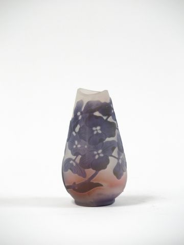 GALLE. Vase en verre, à décor gravé en camée et à l'acide d'hortensias bleus sur fond blanc et rosé. Signé. H. : 9 cm
