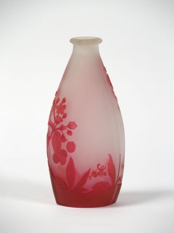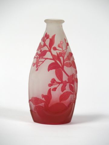GALLE. Vase ovoïde à côtes en verre, à décor gravé en camée et à l'acide de fleurs roses sur fond blanc. Signé. H. : 13 cm