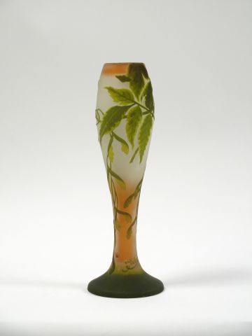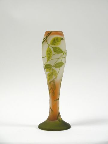 GALLE. Vase ovoïde en verre, à décor gravé en camée et à l'acide de feuillage vert sur fond blanc et rose. Signé. H. : 34,5 cm