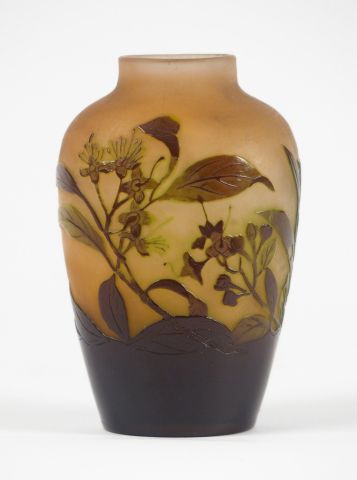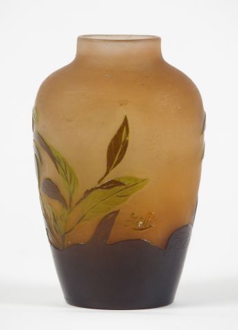 GALLE. Vase ovoïde en verre, à décor gravé en camée et à l’acide de fleurs sauvages vertes et brunes sur fond rosé. (petite bulle éclatée sur le a de la signature) Signé. H. : 12.5 cm