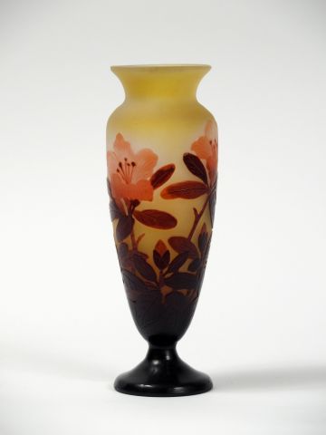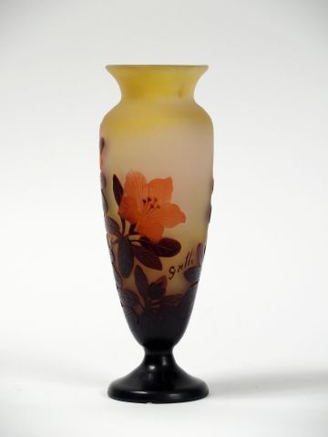 GALLE. Vase ovoïde en verre, à décor gravé en camée et à l'acide de fleurs rouges sur fond jaune. Signé. H. : 20,5 cm