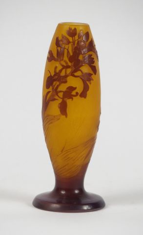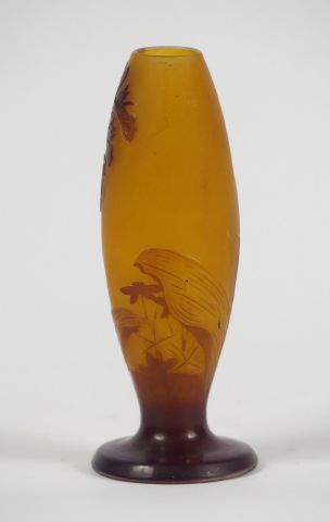 GALLE. Vase ovoïde en verre, à décor gravé en camée et à l’acide de jacinthes brunes sur fond jaune. Signé. (mini bulle sur une des feuilles du décor) H. : 17 cm