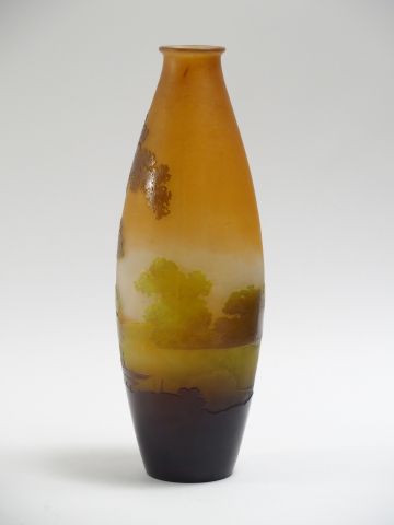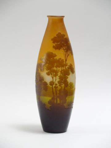 GALLE. Vase ovoïde en verre, à décor gravé en camée et à l’acide de paysage lacustre. H. : 39,5 cm. Signé.