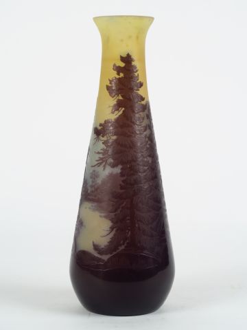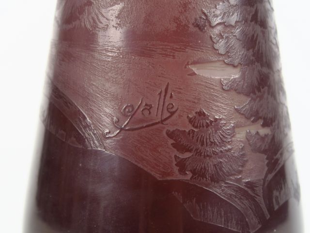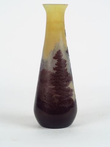 GALLE. Vase ovoïde en verre à décor polychrome gravé en camée à l'acide de paysage vosgien Signé H. 30 cm