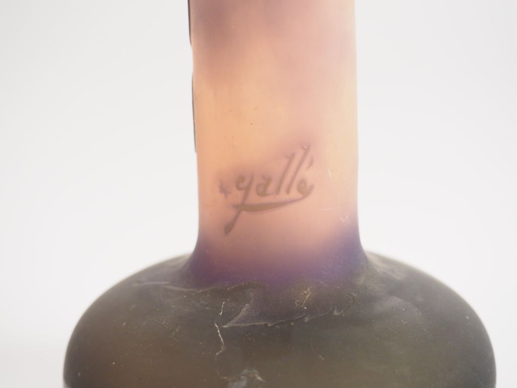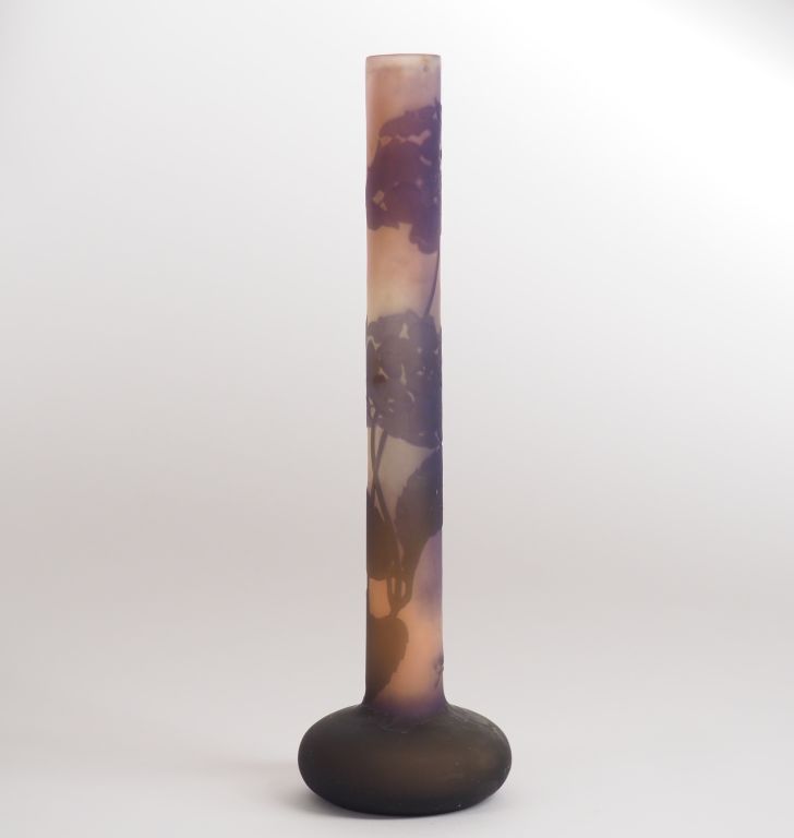 GALLE. Vase soliflore en verre, à décor gravé en camée et à l'acide d'hortensias mauves sur fond rose, vert et blanc. Signé. H. 29,5 cm
