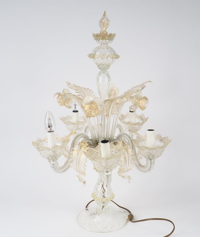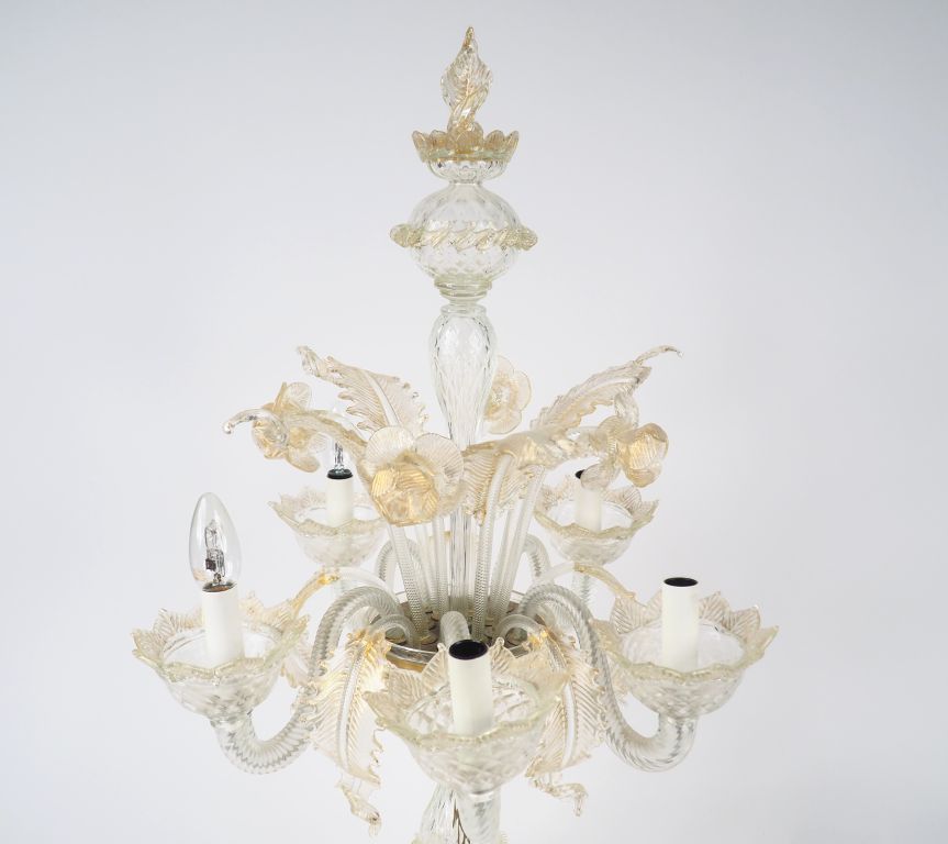 Grand chandelier en verre translucide de Murano pailleté d'or à décor de fleurs et de feuilles. Eclairant à 4 lumières, monté à l'électricité. Dim. 52 x 51 cm.