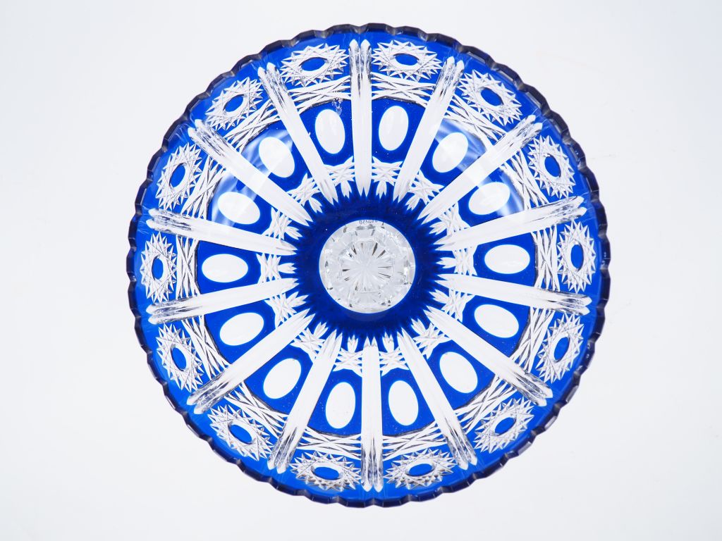 Grand compotier en cristal taillé bicolore à décor de fleurs bleues et translucide. Diam. 25,5 cm