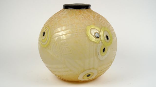 Grand vase boule Art déco en verre à décor gravé et émaillé de motifs floraux stylisés en jaune blanc et noir sur fond marbré blanc orangé. H. 28 cm