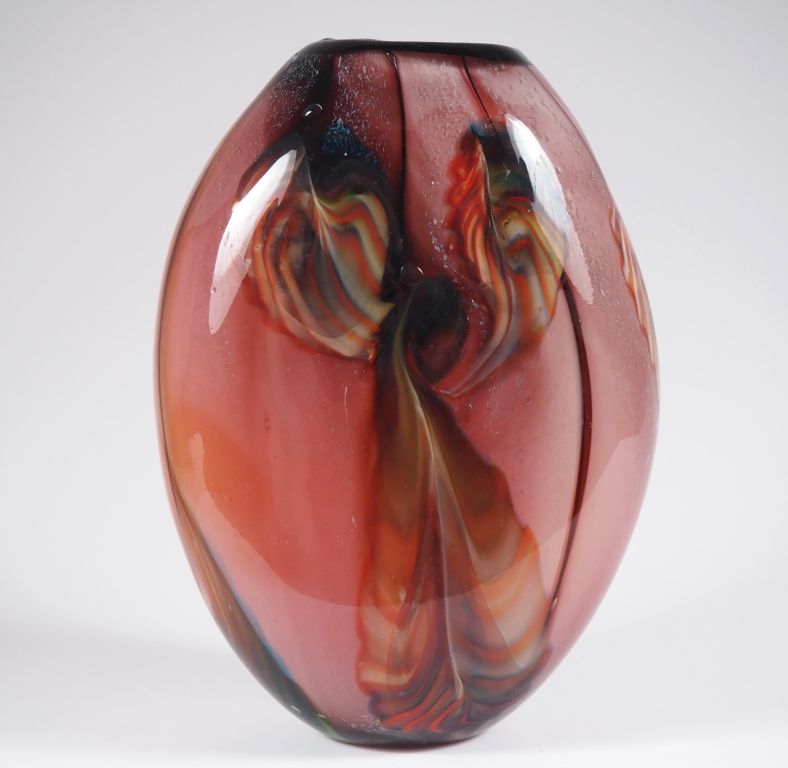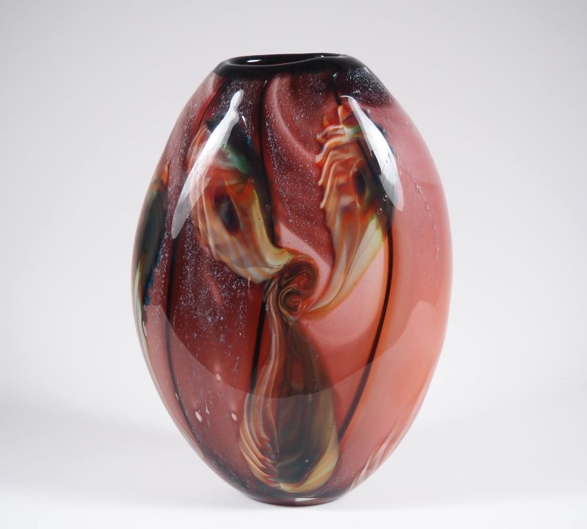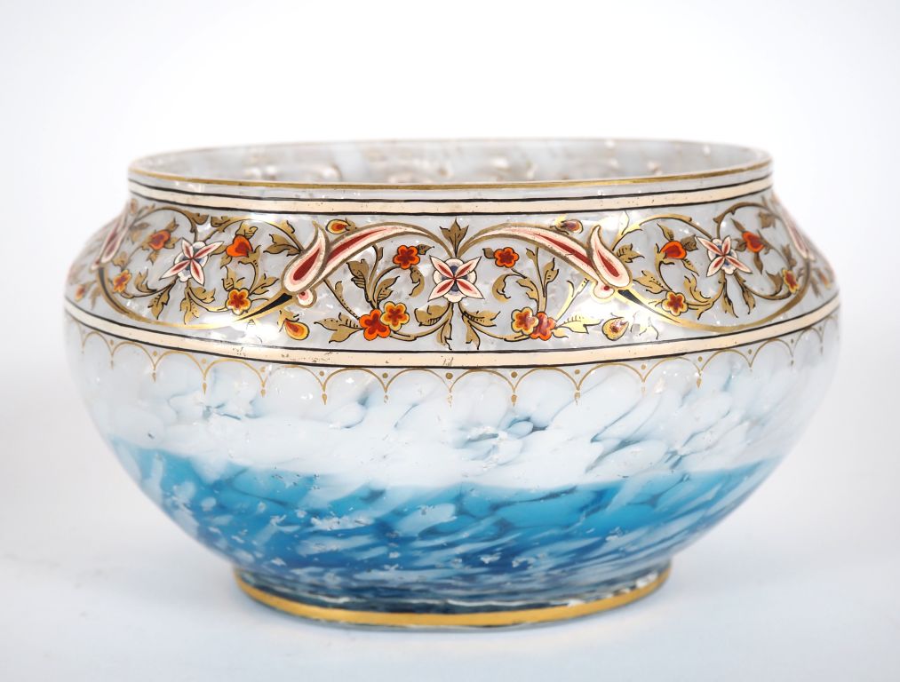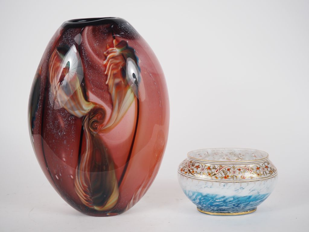 Grand vase ovoide contemporain en verre multi couches. H. 38 cm Coupe ovale en verre moucheté bleu et blanc, à décor émaillé polychrome de rinceaux feuillagés et fleuris. Dim. 11 x 20 cm