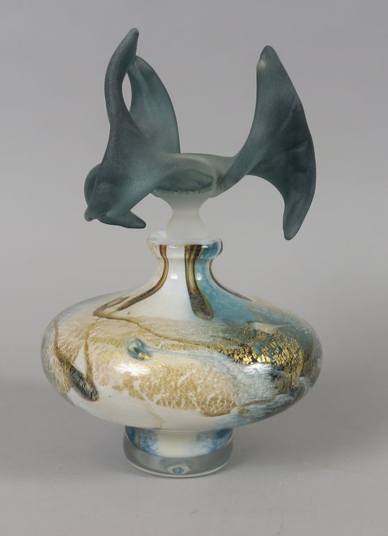 Jean-Michel OPERTO. Flacon en verre, inclusions d'oxydes métalliques. Bouchon en forme d'iris. Signé. H. 24,5 cm