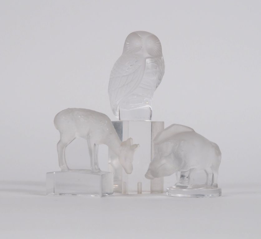 LALIQUE France. 3 presse papier en verre blanc moulé pressé, "Chouette", "Biche" et "Sanglier". Signés. H. 9 cm. Dim. 8,5 x 8 cm. Dim. 7 x 9 cm.