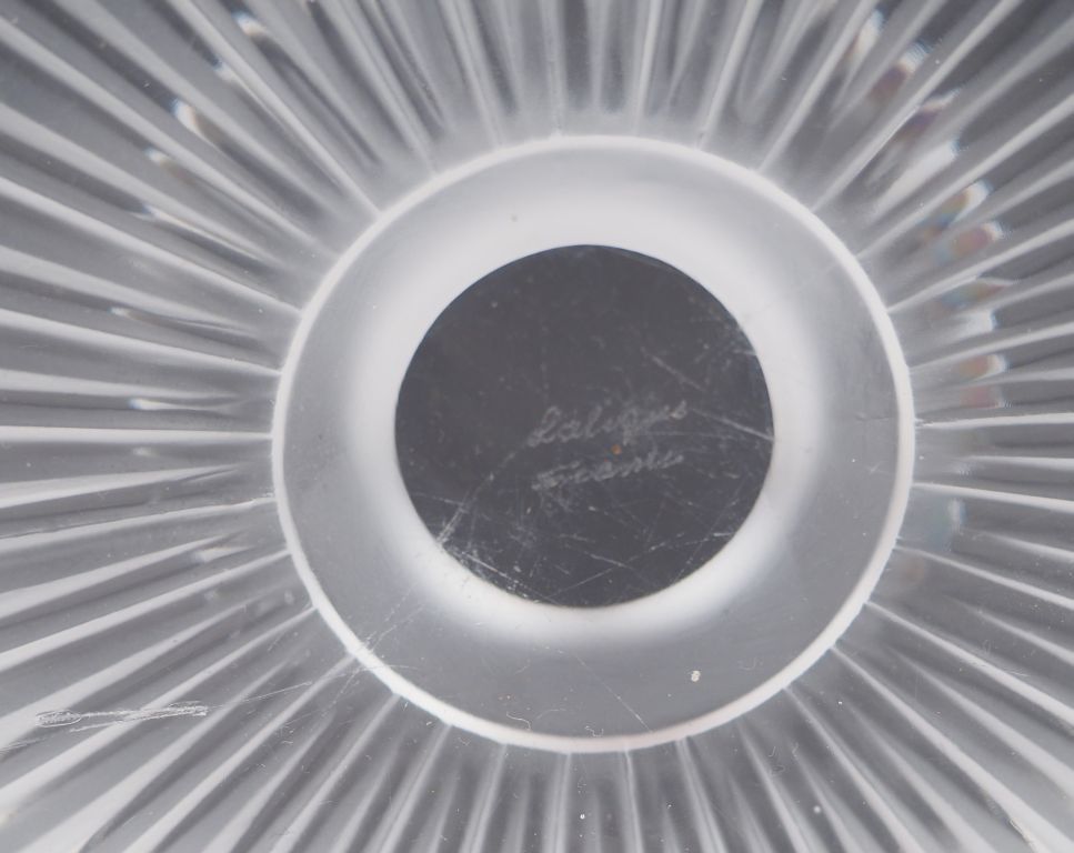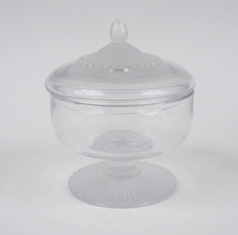 Lot de LALIQUE France. Drageoir en verre. Signé. H. : 19 cm. (égrenure sous au prix de 60 à 80 € en vente aux enchères par l'hôtel des ventes Primardeco