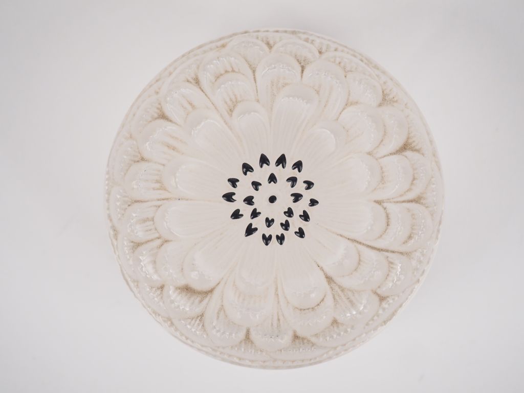 LALIQUE France. Pot à fard en verre et émail noir à décor d'un dahlia. Signé. Dim. 5,8 x 8,6 cm.