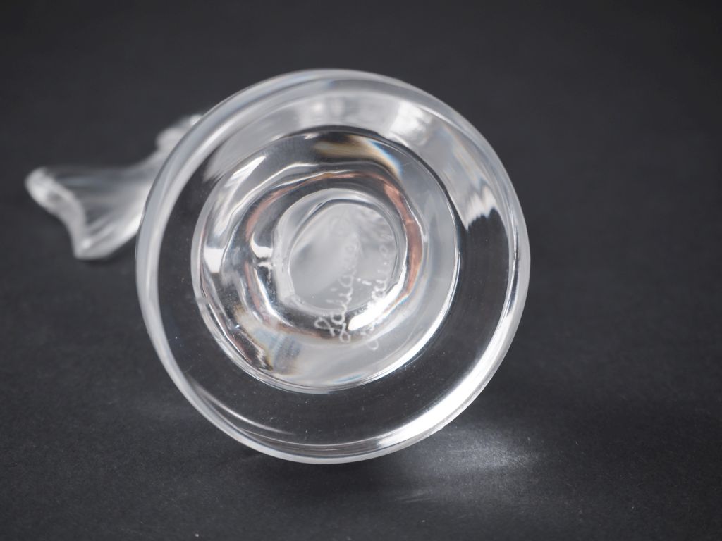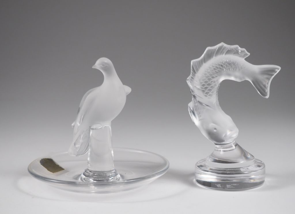 LALIQUE France Sujet en cristal moulé "le saumon" Signé H. 10 cm (un éclat) On y joint LALIQUE France. Baguier en cristal moulé à décor de colombe Signé H. 9 cm (micro égrenure sur une plume)