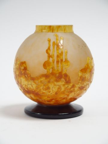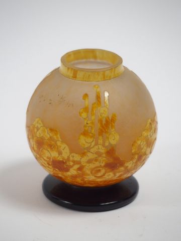 LE VERRE FRANÇAIS. Vase "roses trémières" en verre, à décor gravé en camée et à l'acide jaune orangé sur fond clair. H. : 10 cm. Signé.