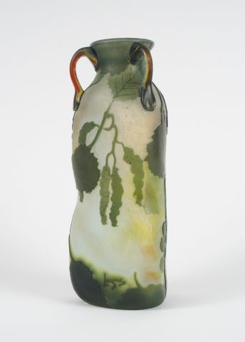 LEGRAS. Vase en verre, à décor gravé en camée et à l’acide de mûrier vert sur fond clair, 3 anses appliquées à chaud. Signé. H. : 21 cm