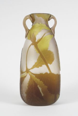 LEGRAS. Vase ovoïde en verre, à décor polychrome gravé en camée et à l’acide de feuilles de châtaigner, anses appliquées à chaud. Signé. H. : 25 cm