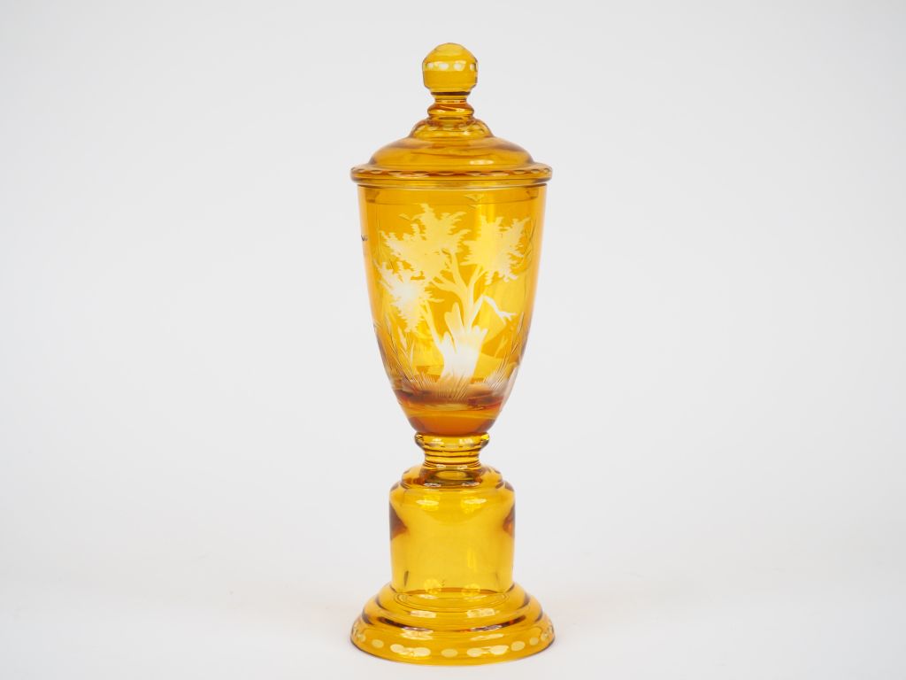 Mazagran couvert en cristal ambré et gravé à décor de motifs cynégétiques. H. 26 cm