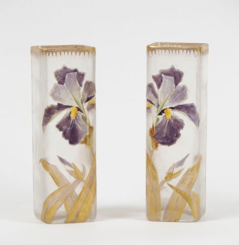 MONTJOIE SAINT DENIS. Paire de vases en cristal émaillé, à décor polychrome d’iris sur fond givré. Signés. H. : 17.5 cm