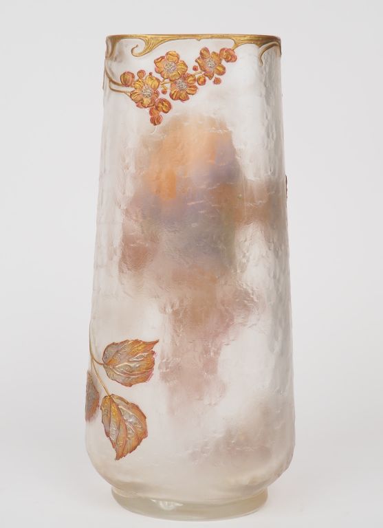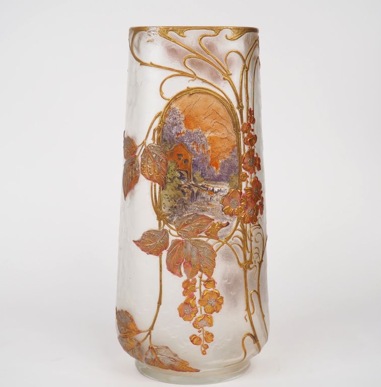 MONTJOIE ST DENIS. Vase en cristal gravé, décor en relief émaillé et doré d'un paysage lacustre et de fleurs. H. 27 cm. (Egrenure au col).