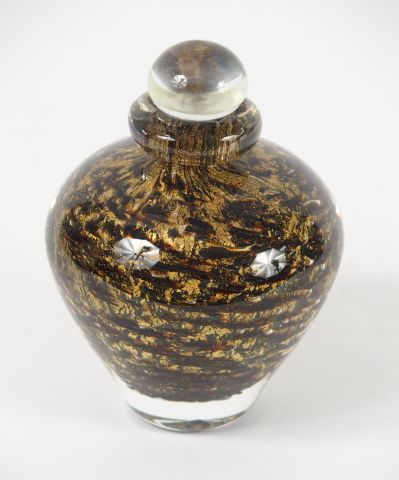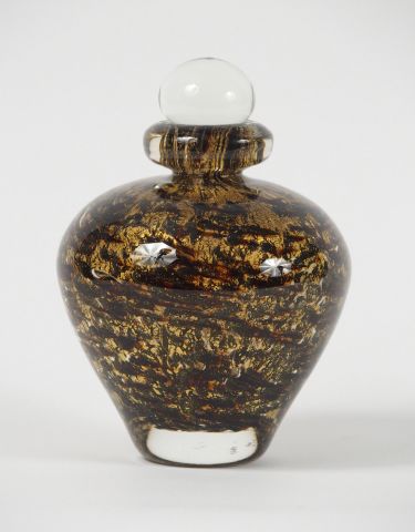 Lot de NOVARO. Flacon en verre polychrome pailleté d’or. Signé. H. : 17 cm au prix de 150 à 250 € en vente aux enchères par l'hôtel des ventes Primardeco