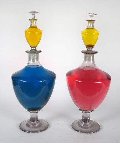 Paire de grands flacons de forme balustre, les bouchons formant de petits flacons. H. 59 cm (égrenure à un bouchon)