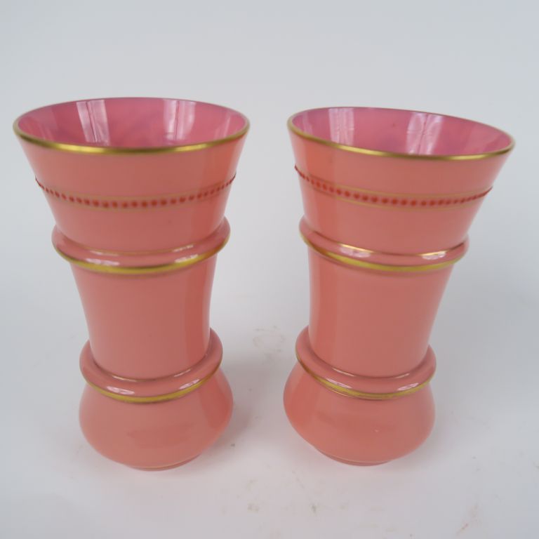 Paire de vases cornet en opaline rose à décor émaillé et doré de frises de perles et de rinceaux. H. 20 cm.