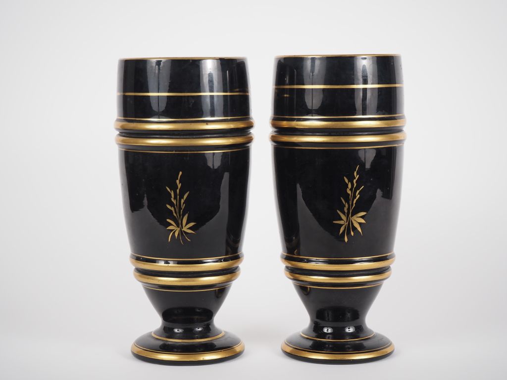 Paire de vases Napoléon III en cristal noir, décor émaillé et doré de motifs feuillagés. H. 25,5 cm