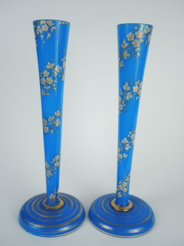 Paire de vases Napoléon III en opaline bleue et émail blanc à décor de fleurs. H. 41 cm