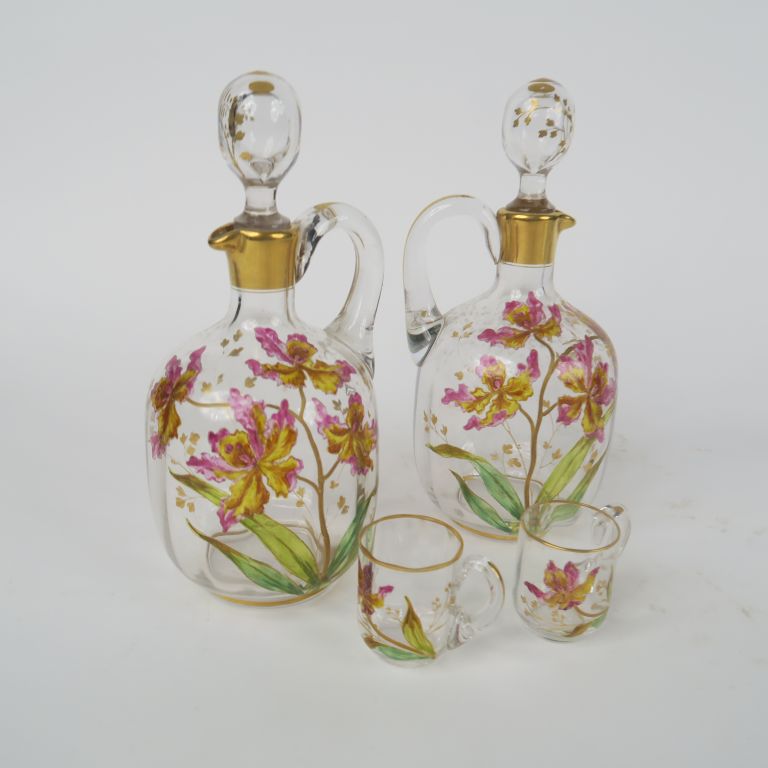 Partie de service à liqueur Art Nouveau en cristal à décor émaillé et doré de fleurs, comprenant 2 flacons et 2 verres à liqueur sur un plateau.