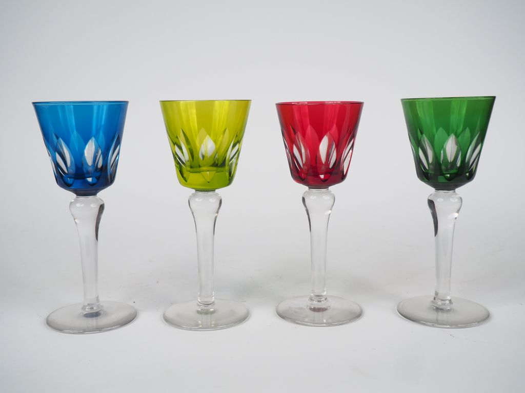 Partie de service de verres à vin du Rhin en cristal bicolore comprenant 13 verres. On y joint 4 verres en cristal bicolore de Saint-Louis.