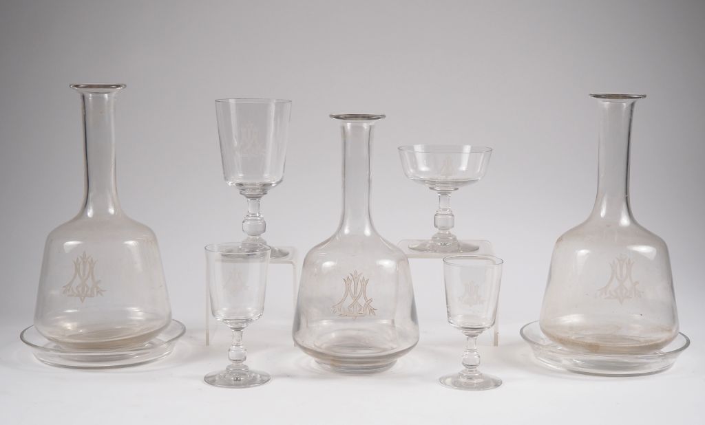 Partie de service de verres en cristal à décor de monogramme comprenant : 13 verres à eau 10 verres à Sauternes 11 verres à Porto 18 coupes à champagne 3 différents flaconss6 dessous de bouteille (micro égrenures)