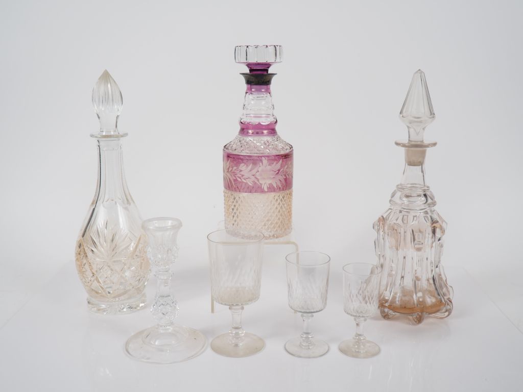 Partie de service de verres en cristal comprenant : 8 verres à eau, 6 verres à Sauternes, 6 verres à vin rouge on y joint un flacon en cristal bicolore, et 2 différents flacons, un bougeoir en cristal