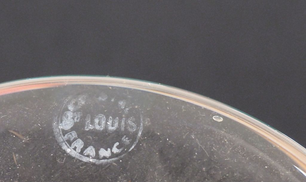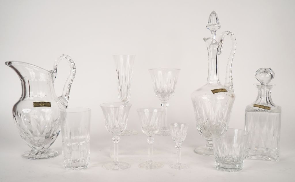 Partie de service de verres en cristal de Saint-Louis comprenant : - 19 verres à eau -18 verres à vin rouge - 12 verres à Sauternes - 17 verres à liqueur - 18 flutes à champagne - 18 verres à long drink - un flacon et 18 verres à whisky - un décanteur - une carafe Signé