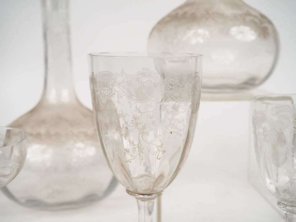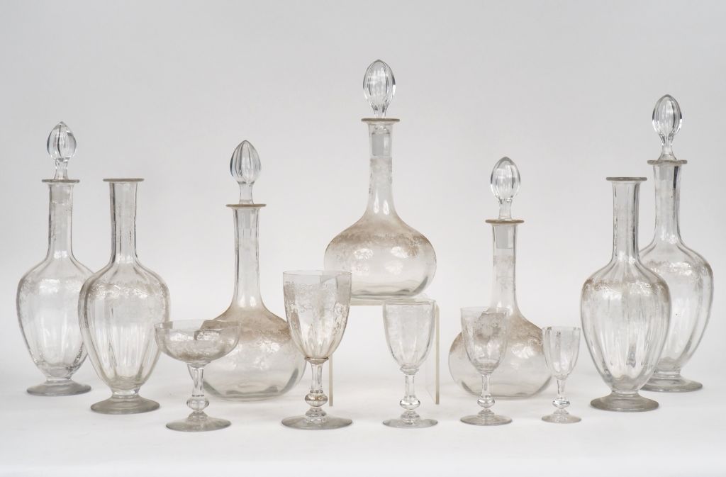 Partie de service de verres Napoléon III en cristal gravé à décor de feuillage et de coquille comprenant : - 23 coupes à champagne - 24 verres à eau - 20 verres à vin rouge - 18 verres à Sauternes - 14 verres à liqueur - 7 flacons et décanteurs (manque deux bouchons)