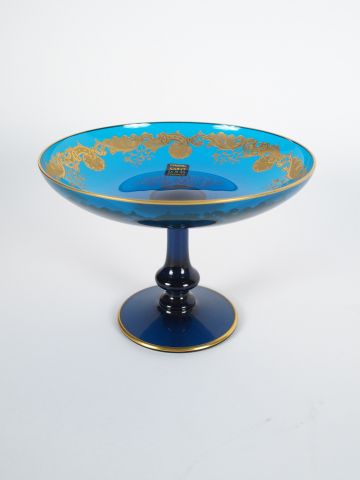 Petite coupe en cristal de St Louis à décor de rinceaux dorés sur fond bleu roi. H. 11 cm. Diam. 15,5 cm