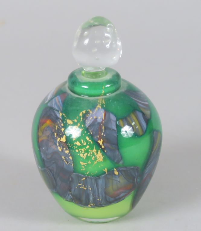 Quatre différents flacons en verre soufflé. Signés. H. 12,5 cm et 9,5 cm